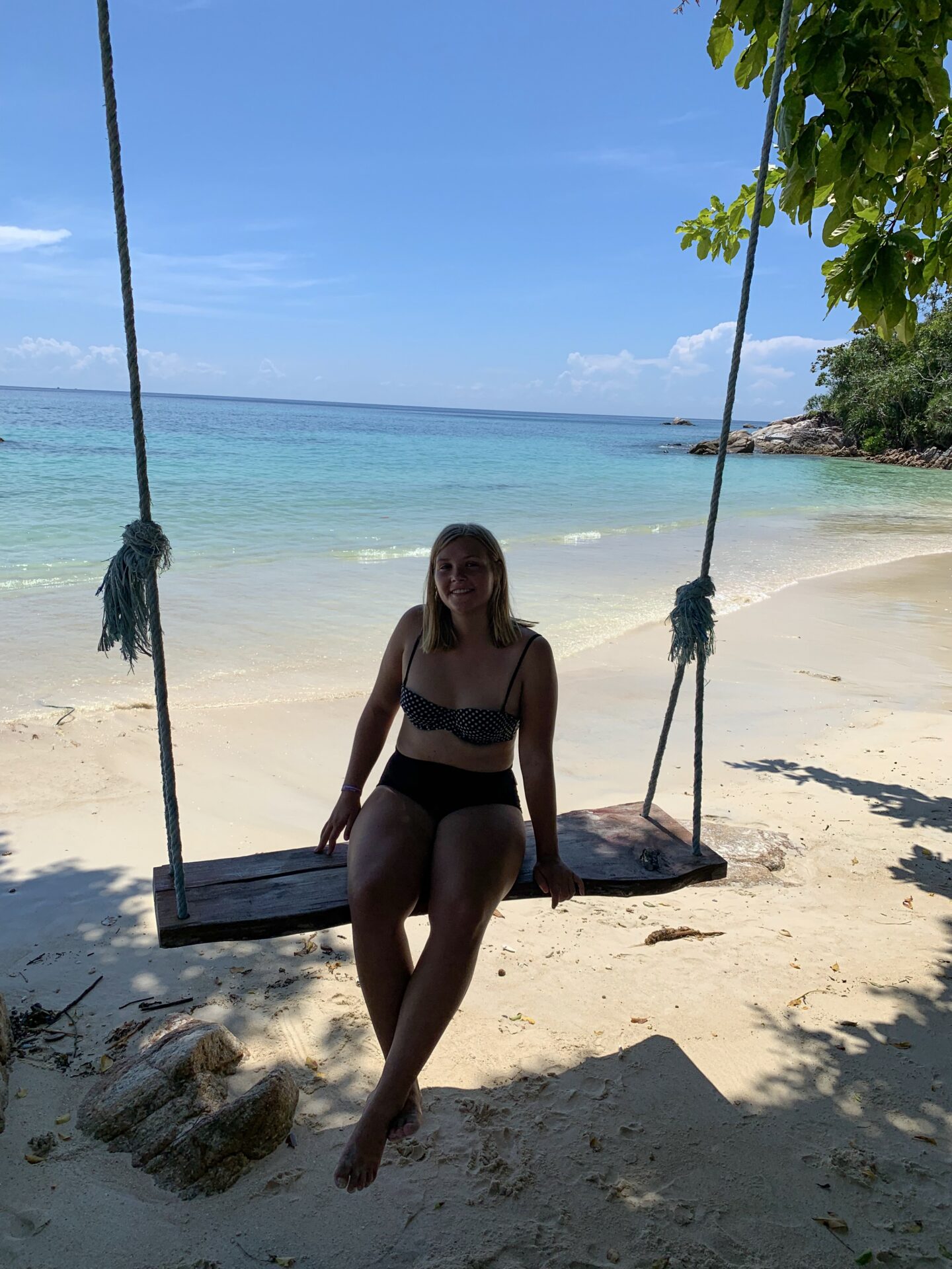 Na een paar uur op het strand te zijn geweest, zijn we de boot naar Langkawi gaan boeken en daarna zijn we naar een ander strand gelopen. Dat was ongeveer tien minuten lopen en was een mooie wandeling. Op dit strand stonden wat schommels waar we wat foto’s op gemaakt hebben. Ook hier zijn we best lang gebleven. Toen we wel weer even klaar waren met het strand, zijn we teruggelopen naar het andere strand en zijn we daar gaan lunchen.