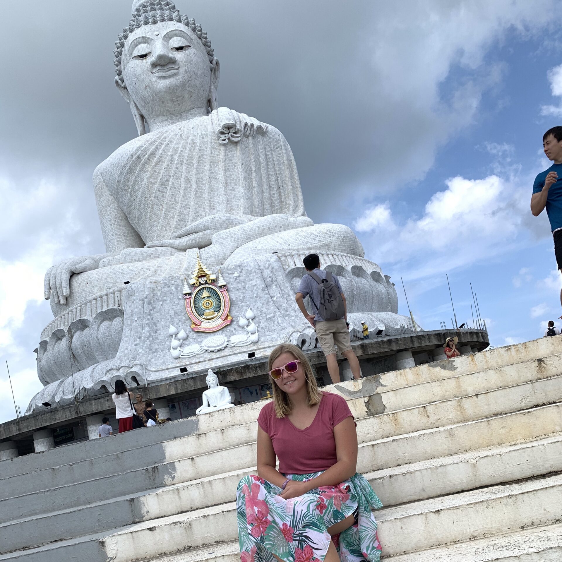 Onze eerste dag in Thailand werd onverwachts een hele lange dag. We hadden het plan om wat sightseeing te doen en daarna naar het strand te gaan. Eerst zijn we naar de Big Buddha geweest. Dat is precies wat de naam zegt: een heel groot beeld van een boeddha. Het beeld zelf is niet het enige waarvoor we daarheen gingen. De Big Buddha ligt namelijk op een heuvel, waardoor je er een mooi uitzicht hebt over het eiland. Na de Big Buddha zijn we naar een strand gegaan en hebben we daar even gezwommen en op het strand gelegen.