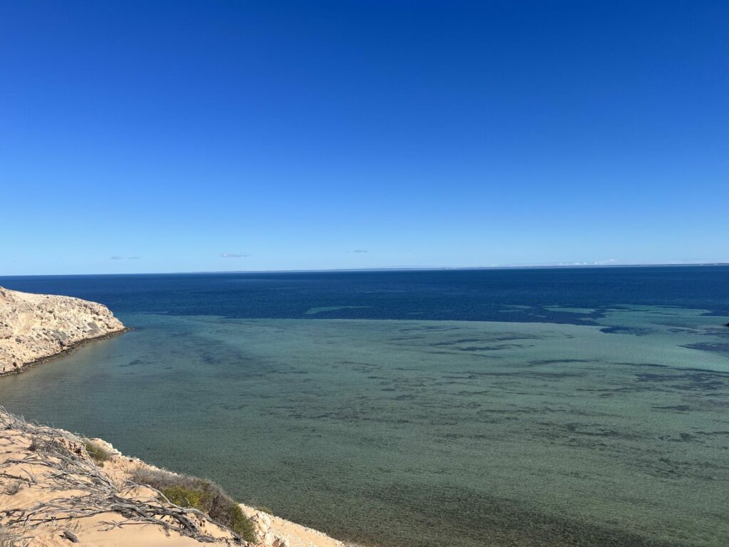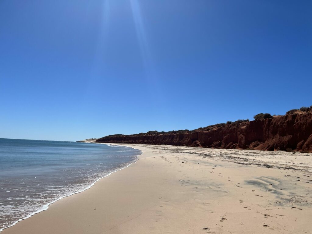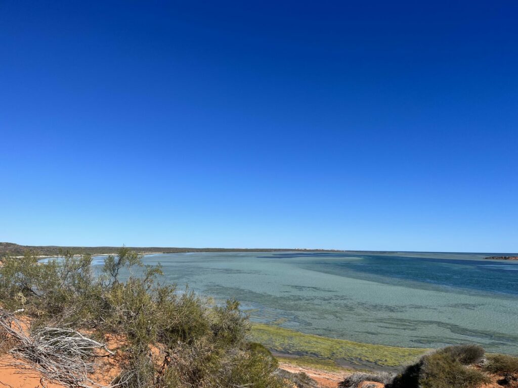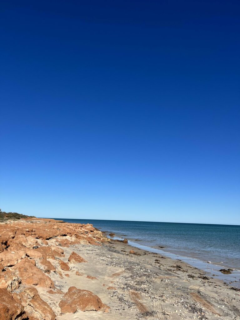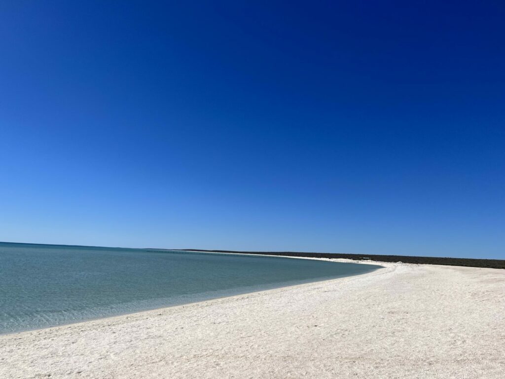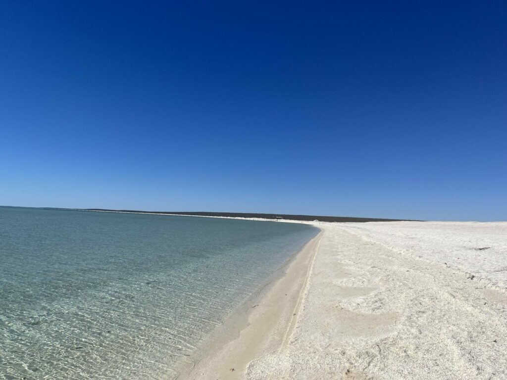 Na twee dagen in Kalbarri National Park te zijn geweest, was het tijd om door te reizen. Onze volgende stop was Shark Bay. Onderweg naar Shark Bay stopten we bij Shell Beach. Dit is precies wat de naam doet vermoeden: een strand met schelpen in plaats van zand. De schelpen zijn spierwit en het water helderblauw, wat het een goede fotostop maakt. Dit strand in zelfs uitgeroepen tot een van de mooiste stranden in West-Australië.