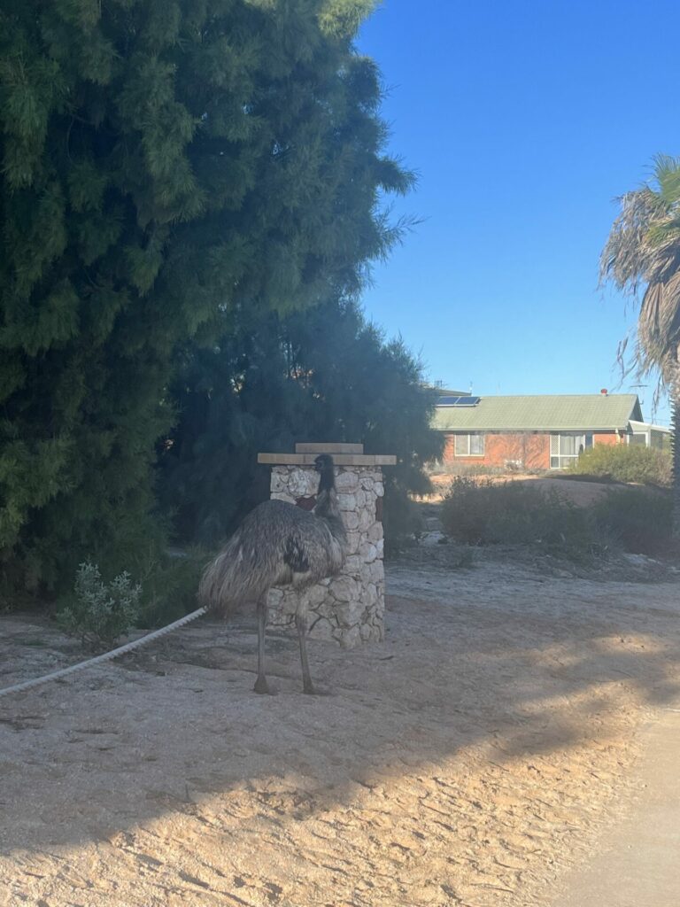Dit waren de laatste twee stops voordat we bij de camping aankwamen. We verbleven op een camping in Denham, een dorpje op het Shark Bay schiereiland. Het dorp zelf is niet zo bijzonder. Je komt hier toch meer om de dingen in de omgeving te zien. Wat wel bijzonder is, is dat er wilde emoes rondlopen in het dorp. Ik had eerlijk gezegd zelf niet verwacht dat we deze zouden zien. Niets bleek minder waar: op de terugweg van een rondje door het dorp lopen, stonden we ineens op een meter afstand van een wilde emoe.
