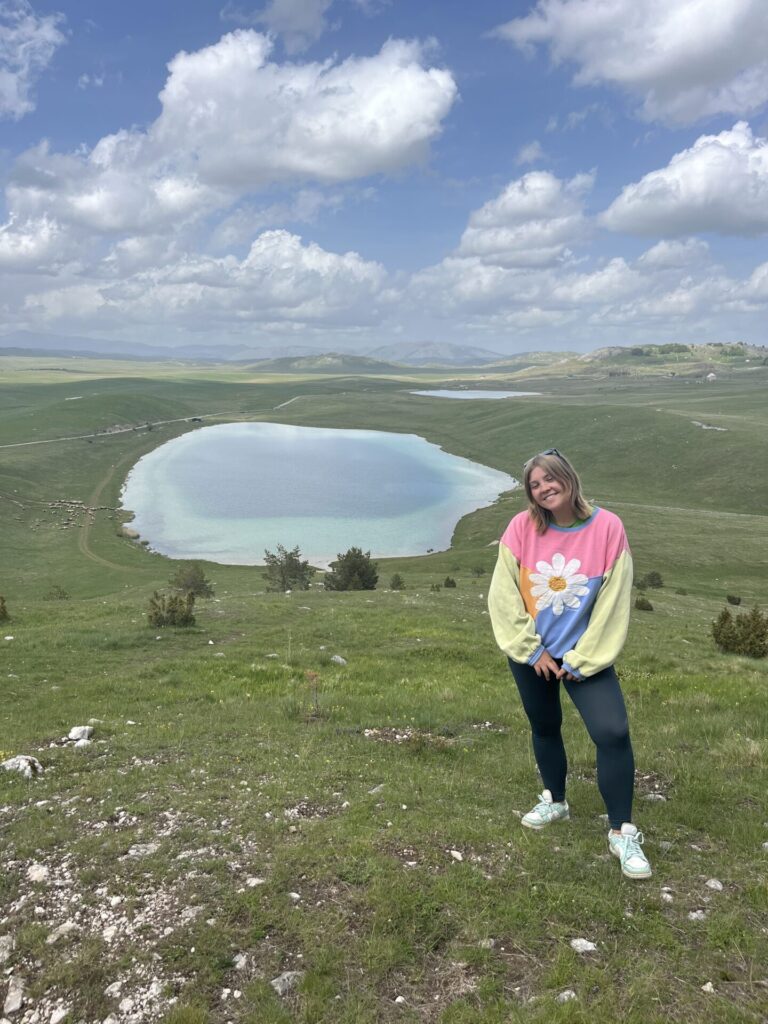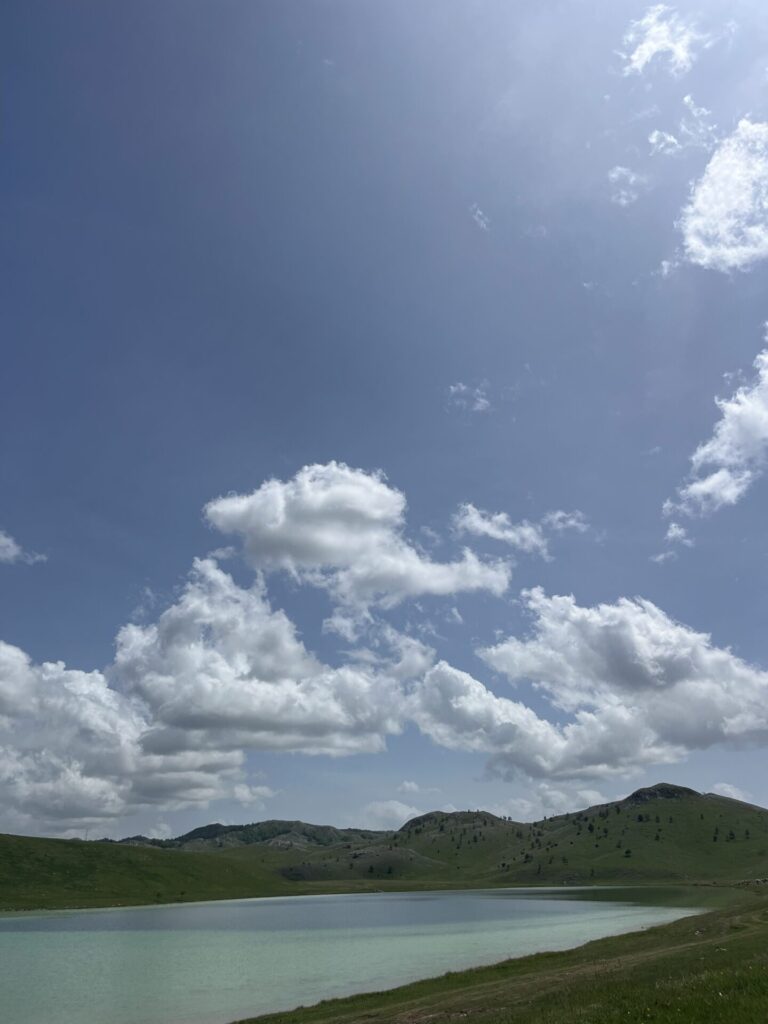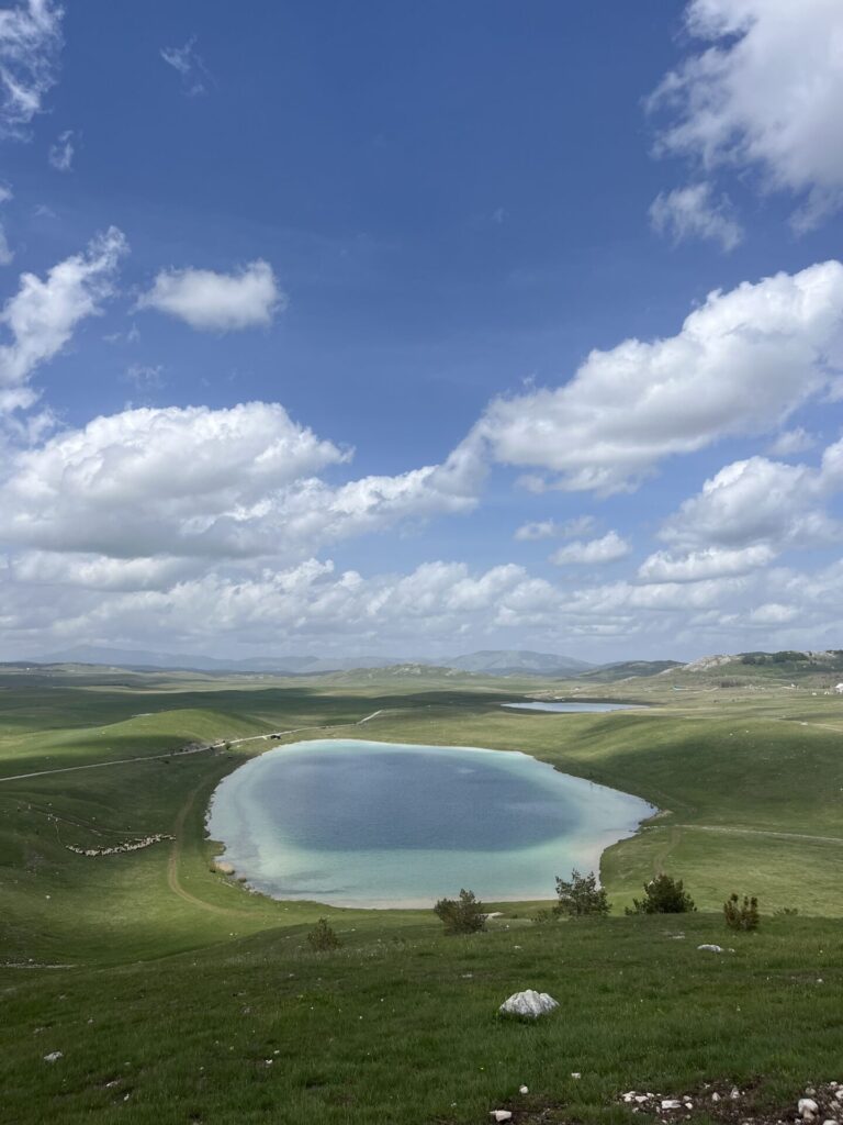 Onze volgende stop was een meer. Dit was best een stuk fietsen, maar de weg liep door een heuvelachtig gebied. Dit was gelukkig niet zo heel zwaar en het uitzicht was ook mooi. Onderweg stopten we een aantal keer om wat foto’s te maken. Een uurtje later kwamen we aan bij Vražje jezero. We besloten om hier te gaan lunchen. Toen we aankwamen stond er een kolonie schapen om het meer heen en vroeg ik me af of de schapen iets te geïnteresseerd zouden zijn in onze lunch. Gelukkig was dat niet het geval en gingen ze langzamerhand de andere kant op.
